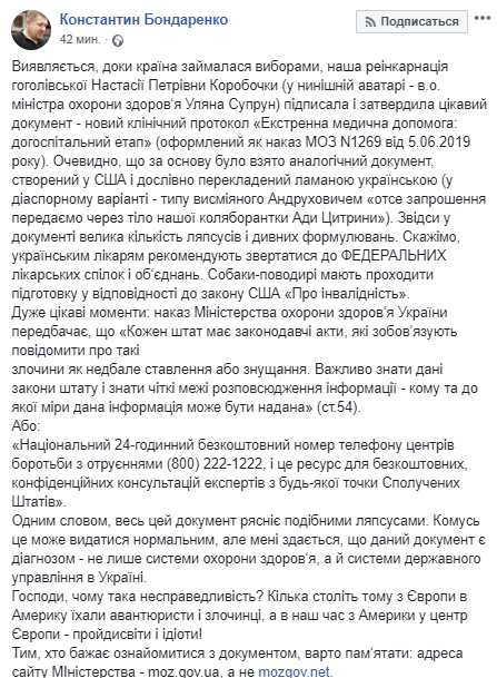 "Обращаться в федеральные союзы". Супрун подписала медицинский протокол, дословно переведя аналогичный документ из США
