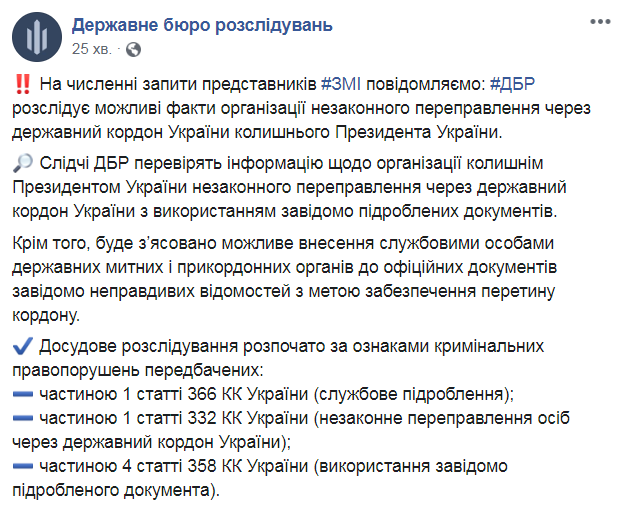 "На многочисленные запросы представителей СМИ сообщаем: ГБР расследует возможные факты организации незаконной переправки через государственную границу Украины бывшего президента Украины.