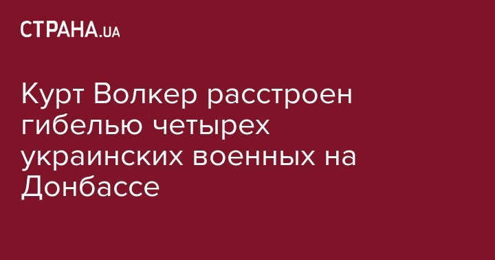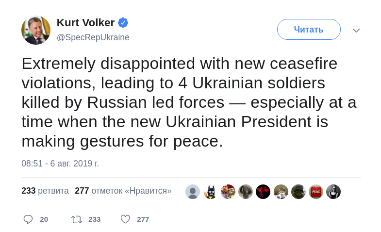"Я очень разочарован новыми нарушениями режима прекращения огня, в результате которых четыре украинских военных были убиты силами, контролируемыми Россией, особенно в то время как новый президент Украины делает шаги по направлению к миру", - написал Волкер в Twitter.