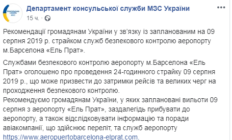 "Службами по контролю безопасности аэропорта Барселоны "Эль Прат" объявлено о проведении 24-часовой забастовки 9 августа 2019 года, что может привести к задержке рейсов и большим очередям на прохождение контроля по безопасности", - сообщили дипломаты.