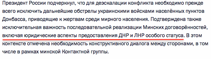 Москва: "Подтверждена также исключительная важность последовательной реализации Минских договоренностей, включая юридические аспекты предоставления ДНР и ЛНР особого статуса".