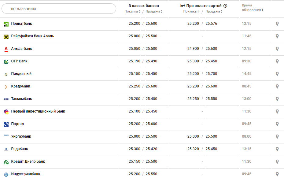 В банках курс доллара в обед был такой: покупка от 25 до 25,35 грн, продажа от 25,45 до 25,65 грн.