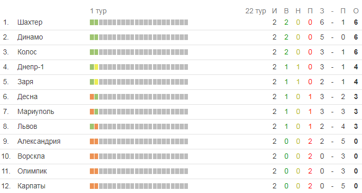 Турнирная таблица чемпионата Украины после двух туров