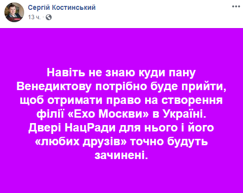 Член Национального совета Украины по вопросам телевидения и радиовещания Сергей Костинский отрицает, что в нашей стране дадут разрешение на работу российской радиостанции "Эхо Москвы". Об этом он написал в Facebook.