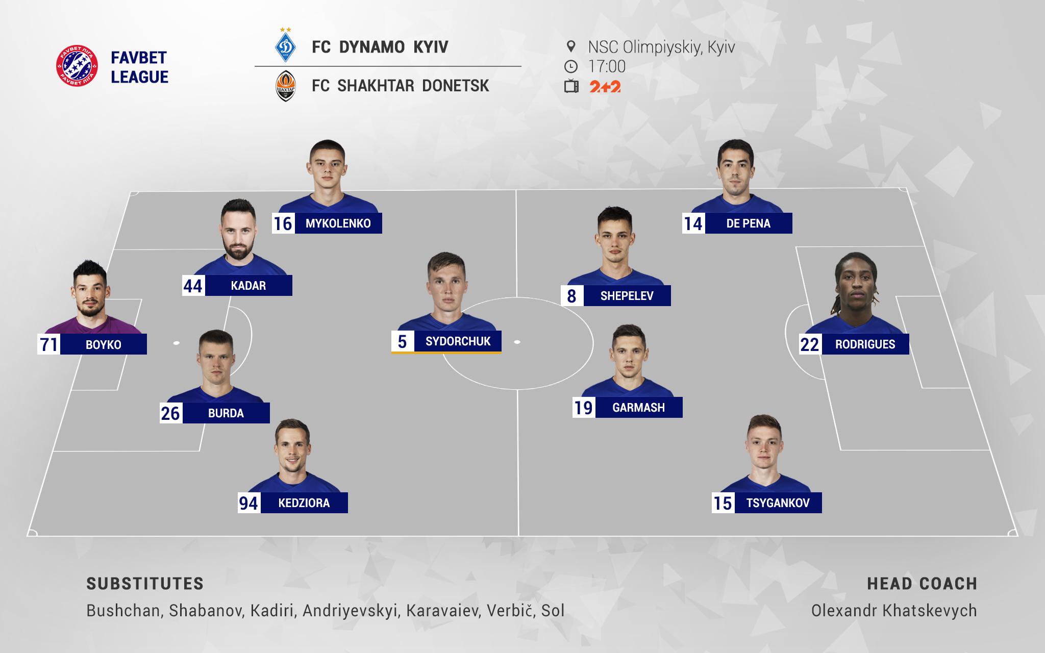 Динамо: Бойко – защитники Кендзера, Бурда, Кадар, Миколенко – полузащитники Гармаш, Сидорчук, Шепелев – нападающие Цыганков, Родригес, Де Пена.
