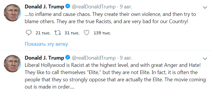 "Либеральный Голливуд - расист высшей пробы, бешеный и ненавидящий! Новый фильм сделан для того, чтобы вызвать и разжечь хаос. Они (в Голливуде. - Ред.) создают насилие, а затем пытаются обвинить других. Они настоящие расисты и очень вредны для нашей страны!" - написал 9 августа глава Белого Дома.