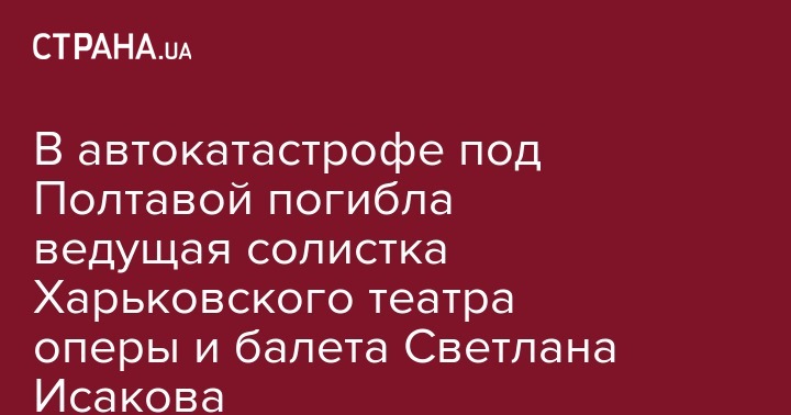 Ведущая солистка Харьковского национального академического театра оперы и балета им. Лысенко Светлана Исакова погибла в автокатастрофе на Полтавщине. Об этом в Facebook сообщает генеральный директор театра Олег Орищенко.