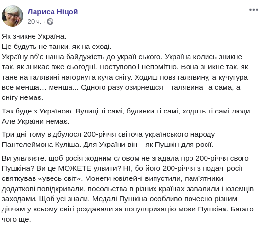 "Вы думаете, чтобы уничтожить Украину, нужны танки? Совсем нет. Достаточно не думать об украинском и хвалить соседнее, увлекаться соседним, развивать соседнее, изучать соседнее, помнить о соседнее, популяризировать соседнее. Этого достаточно, чтобы Украины не стало", - высказалась Ницой.