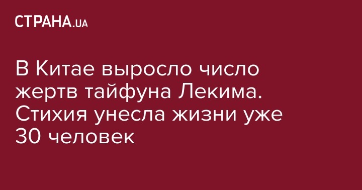 В Китае продолжает свирепствовать тайфун Лекима, количество жертв которого выросло уже до 30 человек. Также 18 человек считаются пропавшими без вести, передает ТАСС.