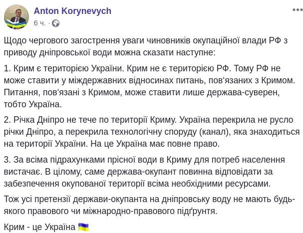 "Относительно очередного обострения внимания чиновников оккупационной власти РФ по поводу днепровской воды можно сказать следующее: Крым является территорией Украины. Крым не является территорией РФ. Поэтому РФ не может поднимать в межгосударственных отношениях вопросы, связанные с Крымом. Вопросы, связанные с Крымом, может поднимать только государство-суверен, то есть Украина", - написал Кориневич.