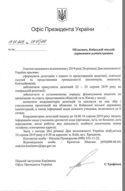 В документе говорится, что для "надлежащего празднования" в 2019 году 28-й годовщины провозглашения независимости Украины в Офисе президента просят сформировать делегации из медработников, работников образования и представителей общественности и "обеспечить присутствие делегаций 22-23 августа 2019 на генеральной репетиции праздника.
