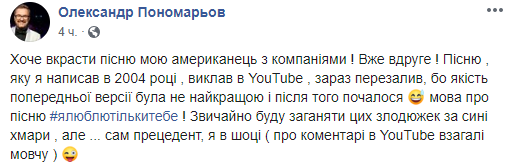 "Хочет украсть мою песню американец с компаниями! Уже во второй раз! Песню, которую я написал в 2004 году, выложил в YouTube, сейчас перезалили, поскольку качество предыдущей версии было не самым лучшим. И после того началось. Речь о песне "Я люблю тільки тебе". Конечно, буду загонять этих воришек за синие тучи, но ... сам прецедент, я в шоке”, - говорится я в сообщении.