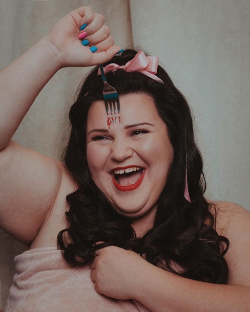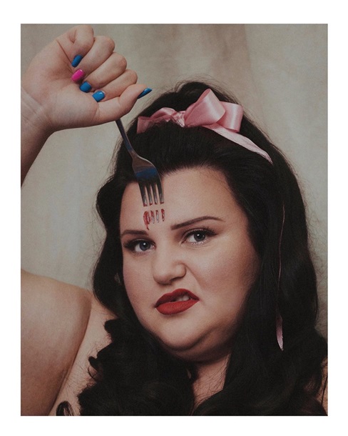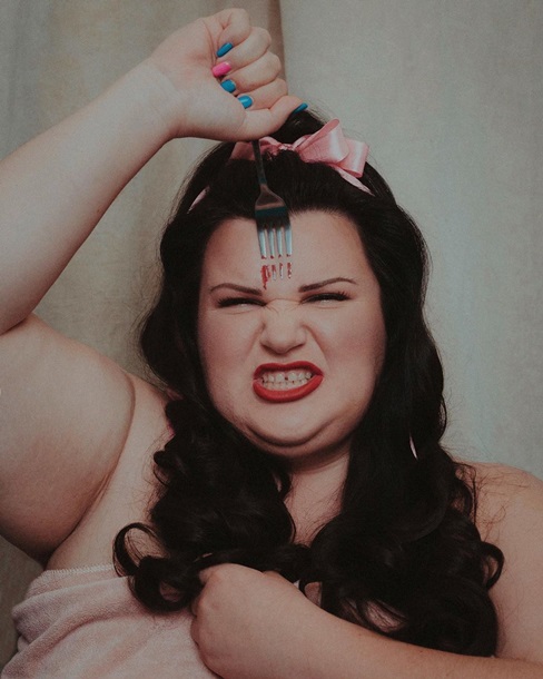 Главной “Фишкой” фотосессии стала окровавленная вилка, которую певица якобы втыкает себе в лоб. Автором съемки стал фотограф Константин Бублик.