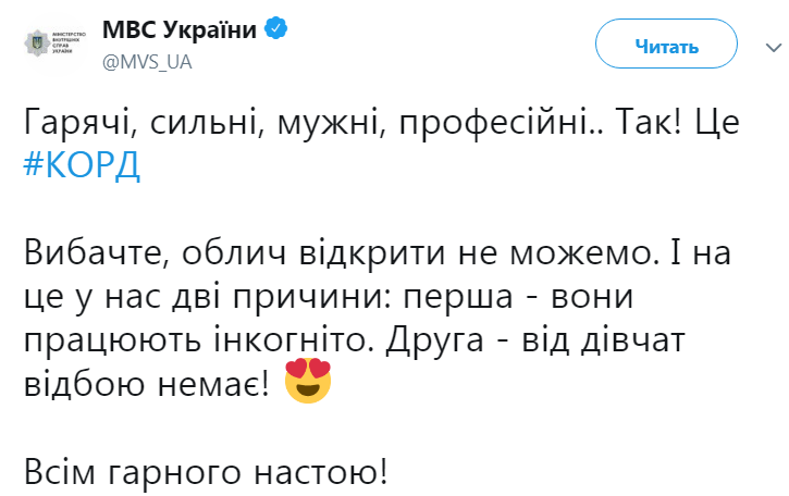 "Горячие, сильные, мужественные, профессиональные... Да! Это КОРД", - значится в твите.