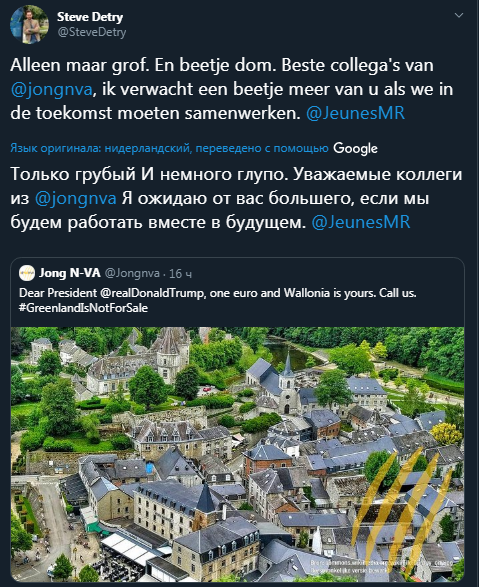 После скандала, вызванного заявлениями президента США Дональда Трампа о желании приобрести остров Гренландия, молодежное крыло бельгийской националистической партии "Новый фламандский альянс" (N-VA) предложило ему купить Валлонию.