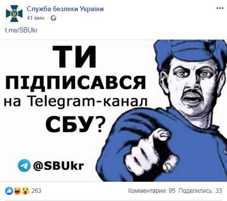 Служба безопасности Украины завела Telegram-канал, а чтобы привлечь на него читателей разместила в Facebook рекламу, визуализировав ее слегка видоизмененным большевистским плакатом "А ты записался добровольцем?"