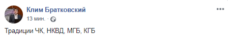 "Традиции ЧК, НКВД, МГБ, КГБ", - написал в Facebook Клим Братковский.