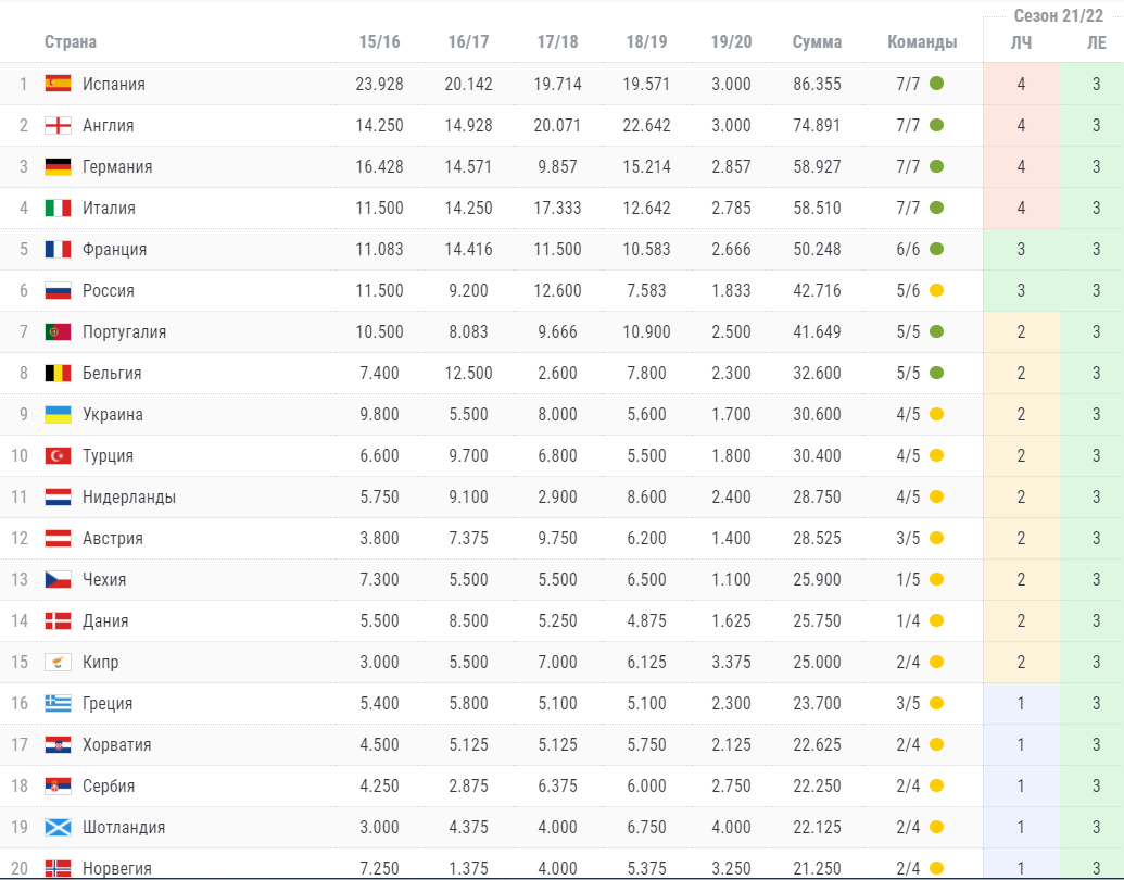 Топ-20 лучших национальных ассоциаций в рейтинге УЕФА