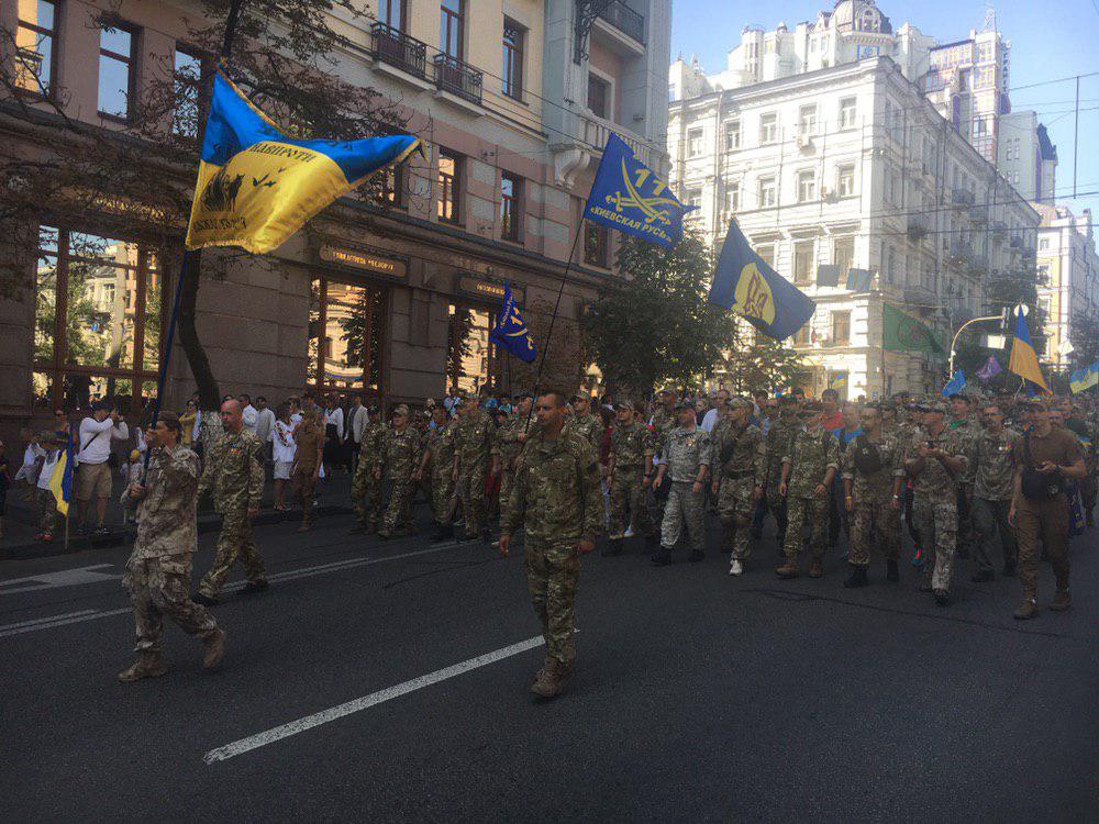 12:20 В колонне Марша националистов следующее размещение: за матерями и детьми погибших участников АТО идет колонна города Киев. За ним - в сером камуфляже представители Муниципальной варты (скорее всего, это представители С14, переодетые в форму Варты - Ред.), за ними батальон "Киевская Русь", потом "Айдар". Потом - в колонне ветераны 93 бригады.