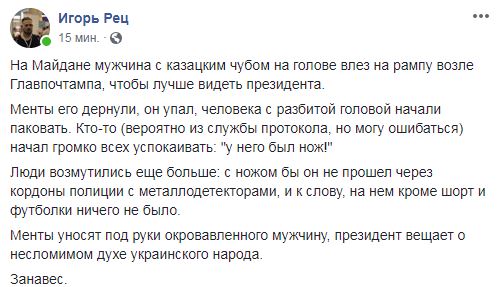 "На Майдане мужчина с казацким чубом на голове влез на рампу возле Главпочтампа, чтобы лучше видеть президента. Менты его дернули, он упал, человека с разбитой головой начали паковать. Кто-то (вероятно из службы протокола, но могу ошибаться) начал громко всех успокаивать: "у него был нож!"