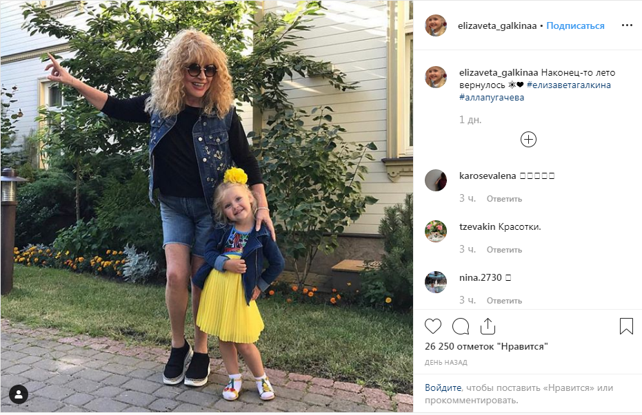 70-летняя певица Алла Пугачева надела шорты выше колен и сфотографировалась с пятилетней дочерью Лизой.
