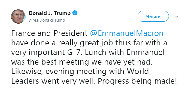 "Франция и президент @EmmanuelMacron проделали действительно большую работу по очень важной встрече G-7. Обед с Эммануэлем был лучшей встречей, которую мы когда-либо имели. Кроме того, вечерняя встреча с мировыми лидерами прошла очень хорошо. Достигнут прогресс!", - написал Трамп.