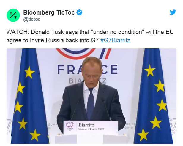 09.17 Глава Европейского совета Дональд Туск предложил обсудить приглашение Украины на следующий саммит G7 вместо России. Об этом он заявил, выступая на пресс-конференции перед началом саммита  в Биаррице, передает Bloomberg в своем Twitter.