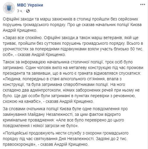 "Человек, предварительно в состоянии алкогольного опьянения, упал с конструкции, и был задержан сотрудниками полиции. На него составлены два админпротокола, никаких запрещенных вещей при нем не было", - рассказал начальник полиции Киева Андрей Крищенко.