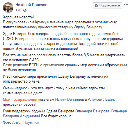 Напомним, 12 декабря 2018 года при въезде в Крым силовики РФ 12 декабря задержали гражданина Украины, крымскотатарского активиста Эдема Бекирова. Бекиров - один из крымскотатарских общественных активистов поселка Новоалексеевка. Его жена, Гульнара, является членом Меджлиса крымскотатарского народа. В январе 2018 года Эдем перенес операцию на сердце, в ходе которой ему были установлены 4 шунта. Кроме того, он носит съемный протез на правой ноге (ниже колена).