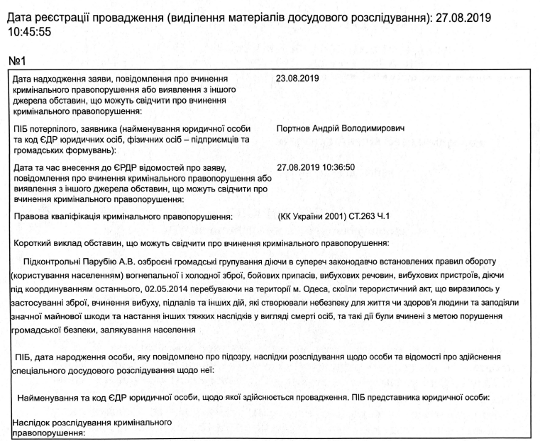 Также сообщается, что подконтрольные Парубию группировки действовали в нарушение законодательно установленных правил оборота оружия, боеприпасов и взрывчатых веществ. Их прямо обвинили в совершении теракта 2 мая 2014 года.