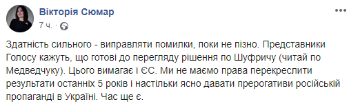 Позже Сюмар заявила, что еще можно "исправить ошибки" и что представители Голоса говорят, что готовы к пересмотру решения по Шуфричу - читай по Медведчуку - добавила Сюмар. Также она заявила, что этого требует и Евросолидарность.