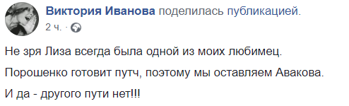 "Не зря Лиза всегда была одной из моих любимиц. Порошенко готовит путч, поэтому мы оставляем Авакова. И да - другого пути нет!", - иронизирует блогер Виктория Иванова.
