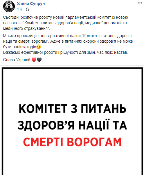 "Есть предложение альтернативного названия "Комитет по вопросам здоровья нации и смерти врагам". Ведь в вопросах здравоохранения не может быть полумер. Желаем эффективной работы и решимости для изменений, время которых пришло", - говорится в сообщении.