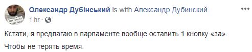"Кстати, я предлагаю в парламенте вообще оставить одну кнопку "за". Чтобы время не терять", - написал депутат.