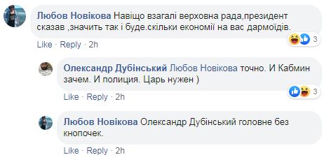 "Зачем вообще Верховная Рада. Президент сказал, значит так и будет, сколько экономии на вас, дармоедов", - иронизирует одна из подписчиа Дубинского.