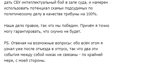 "Во-первых, факт того, что копают это дело, а не дело 2015 года, может значить, что Таймер решили оставить в покое, сосредоточившись на мне лично. Что не может не радовать: по крайней мере, оставят в покое нашу команду, а это отлично. А говоря лично обо мне, за последние 5 лет я уже немного устал ждать продолжения событий 2015 года и готовиться к ответным действиям. Ожидание дейстивительно утомляет, и вот оно, похоже, подошло к концу. Я готов дать СБУ интеллектуальный бой в зале суда, и намерен использовать потенциал скамьи подсудимых по политическому делу в качестве трибуны на 100%", - написал Ткачев.