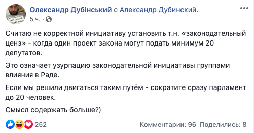 "Это означает узурпацию законодательной инициативы группами влияния в Раде. Если мы решили двигаться таким путем - сократите сразу парламент до 20 человек. Смысл содержать больше?", - пишет Дубинский.