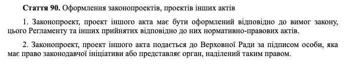 Отметим, что согласно статье 90 Регламента Верховной Рады, для подачи законопроекта в Раду депутату достаточно поставить только свою подпись под этим документом.