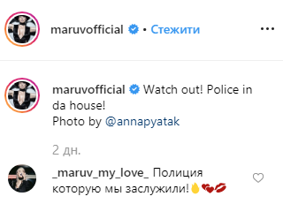 Эпатажная украинская певица MARUV на своем выступлении предстала в образе соблазнительного полицейского. Снимки с концерта артистка опубликовала в Instagram.