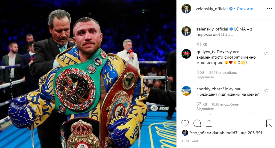 Президент Украины Владимир Зеленский поздравил боксера Василия Ломаченко с победой над британцем Люком Кэмпбеллом. Об этом глава государства написал в Instagram.