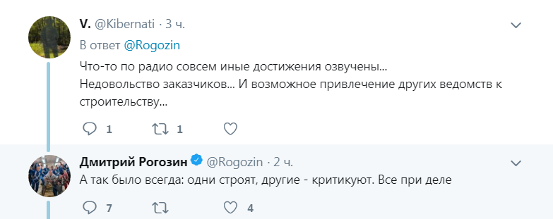 "А так было всегда: одни строят, другие - критикуют. Все при деле", - написал руководитель "Роскосмоса".