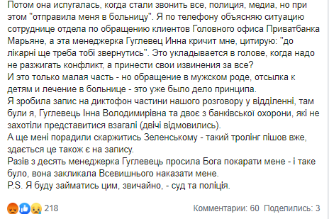 "В 17:40 Приватбанк принёс мне официальные извинения после прослушивания аудио записи, сделанной на диктофон моего телефона. К сотруднице предпримут "управленческие решения" и предложили бесплатный выпуск карты Mastercard World (понятия не имею что это даёт мне)", - сообщила Анасатсия-Крисель.