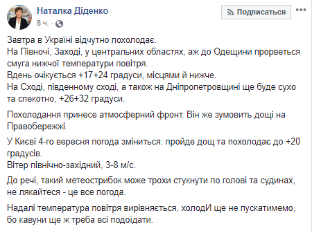 "Кстати, такой метеопрыжок может немного стукнуть по голове и сосудам, не пугайтесь - это все погода. В дальнейшем температура воздуха выровняется, холод еще не пустим, потому что арбузы еще надо доесть", - написала Наталья Диденко.