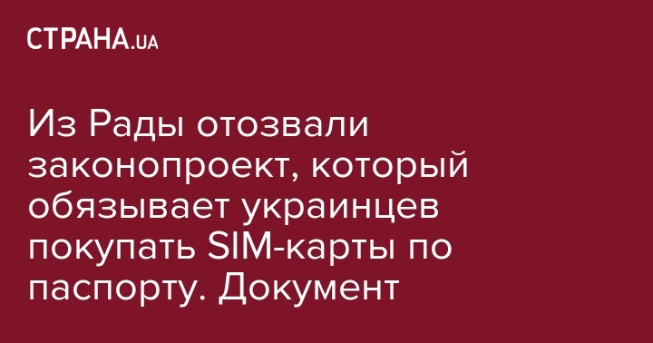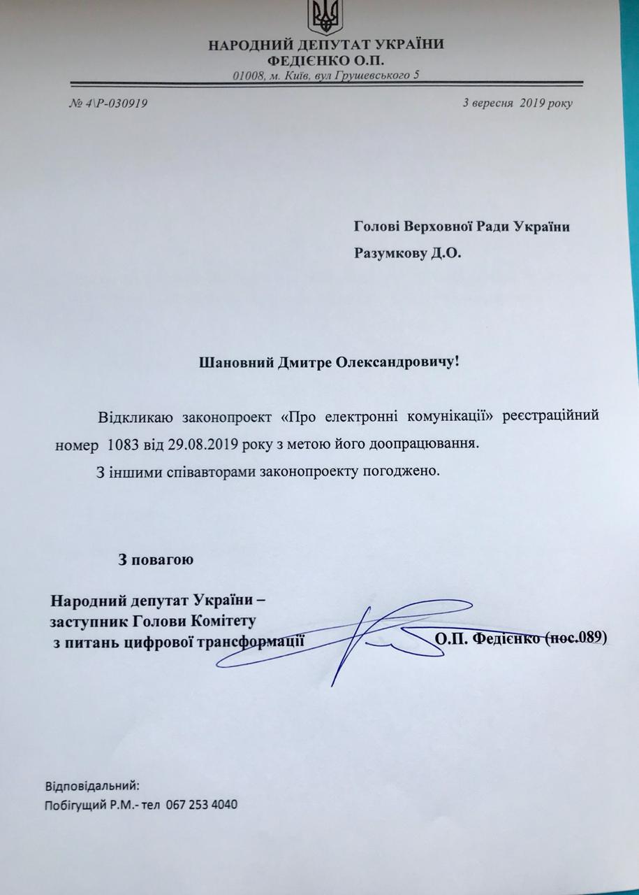 Народный депутат, замепредседателя Комитета по вопросам цифровой трансформации Александр Федиенко подписал обращение к спикеру Рады Дмитрию Разумкову об отзыве законопроекта, которым, в частности, предусматривается продажа SIM-карт по паспорту, для доработки. Об этом пишет InternetUA.