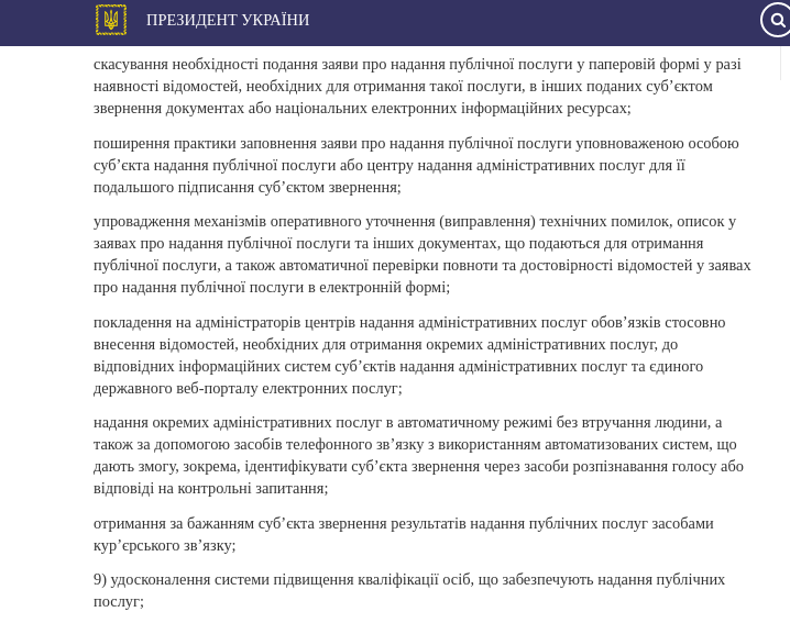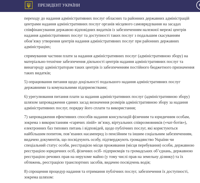Согласно указу "О некоторых мерах по обеспечению предоставления качественных публичных услуг", правительство должно изменить деятельность центров предоставления административных услуг (ЦПАУ). Так, предлагается перейти к предоставлению админуслуг областных и районных госадминистраций ЦПАУ органов местного самоуправления на основе софинансирования государством соответствующих расходов с обеспечением надлежащей сети данных центров и доступности таких услуг с последующим упразднением обязанности образования ЦПАУ при райгосадминистрациях.