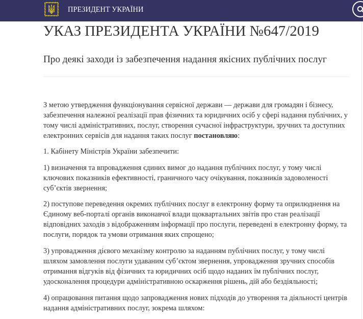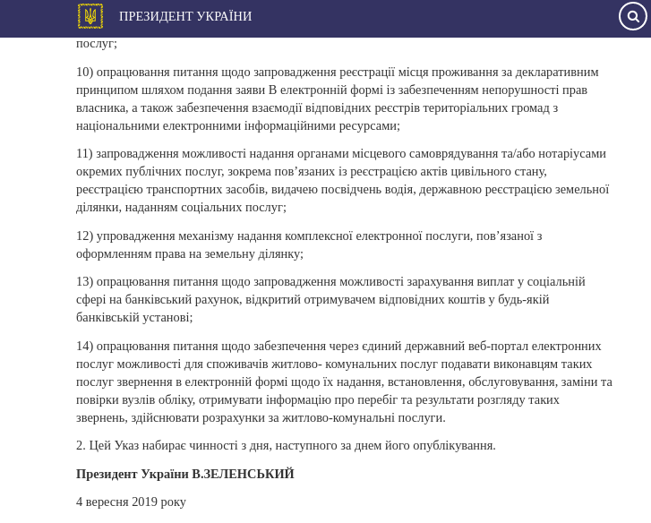 Президент Украины Владимир Зеленский подписал указ, согласно которому Кабинет министров должен обеспечить постепенный перевод отдельных публичных услуг в электронную форму, а также упростить процедуру предоставления услуг и внедрить механизм контроля. Соответствующий указ №647/2019 от 4 сентября опубликован на сайте главы государства.
