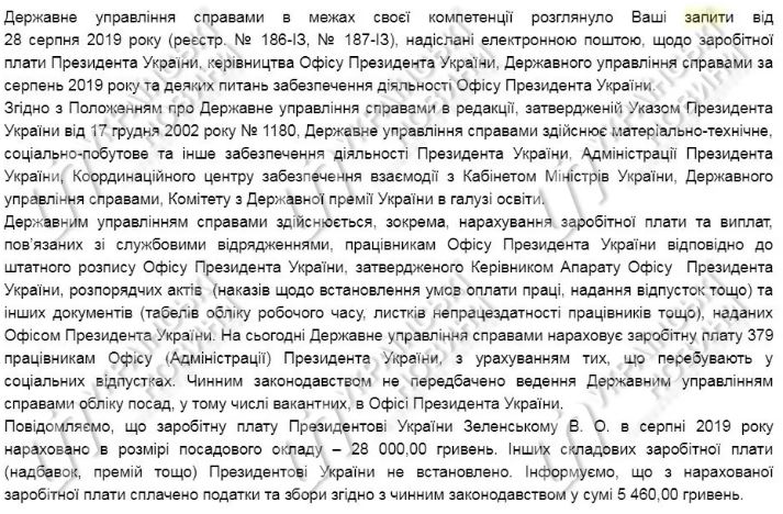 "Заработную плату Президенту Украины Зеленскому В. А. в августе 2019 года начислено в размере должностного оклада – 28 000 гривен. Других составляющих зарплаты (надбавок, премий и т.п.) Президенту не установлено", - сказано в нем.