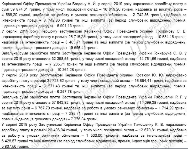 Замруководители Офиса Алексей Гончарук и Юрий Костюк также получили в августе зарплату выше, чем у Зеленского -  32 399 и 31 724 гривны соответственно.