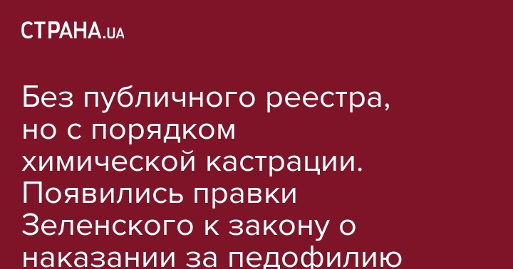 Так, Зеленский отмечает, что принятый Радой закон № 6449 об усилении ответственности за преступления, совершенные в отношении малолетнего, несовершеннолетнего, лица, не достигшего половой зрелости, не содержит четко определенного порядка принудительного применения химической кастрации.
