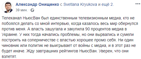 "Телеканал НьюсВан был единственным телевизионным медиа, кто не побоялся делать со мной интервью, когда казалось весь мир обернулся против меня. А власть зашугала и закупила 90 процентов медиа в Украине. У них тогда начались проблемы, но они вырвались и сумели построить на соперничестве с властью хорошее промо себя. Ни один чиновник или политик не выигрывает от войны с медиа, и в этот раз не будет иначе. Жду завтрашних рейтингов НьюсВан. Уверен, что они взлетят" - написал экс-нардеп Александр Онищенко.